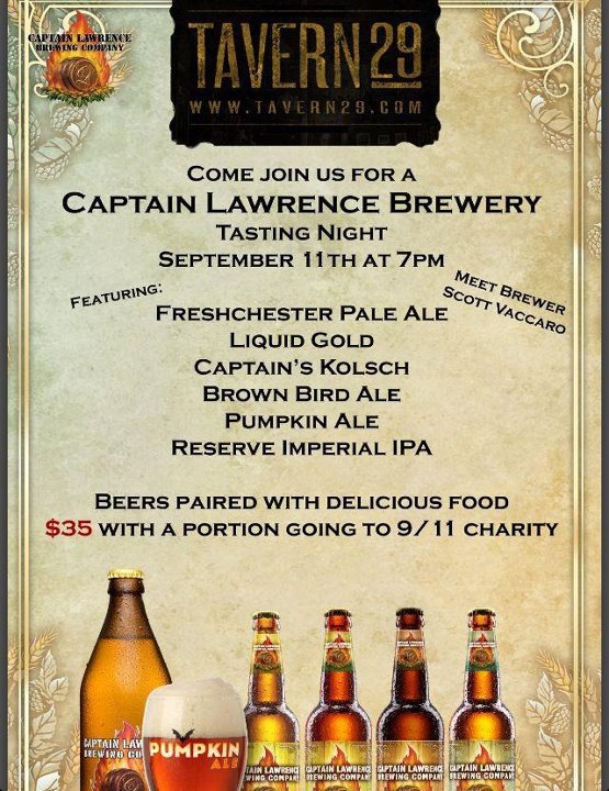Beginning promptly at 7pm, Tavern 29 menu items will be paired with Captain Lawrence beers: