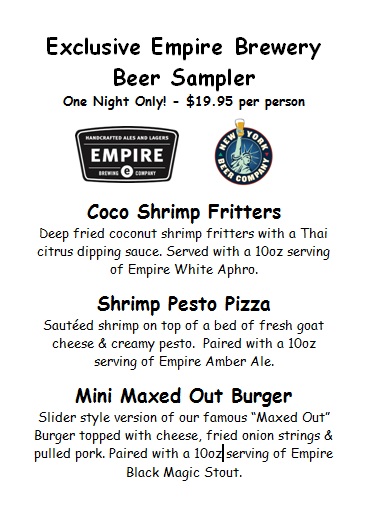 Select dishes will be paired with Empire Brewery’s finest offerings, both exclusive & seasonal. Only $26.95 per person (or $50 for two)