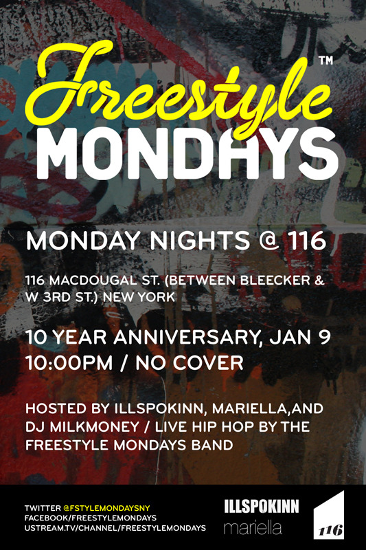 Hosted by Illspokkin, Mariella & DJ Milkmoney Live Hip Hop By The Freestyle Mondays Band: a rotating line up of NY’s finest including David Cinquegrana, Chris Cuzme, Camau Bernstein, Claudio Rochat-Felix, Big Yuki, Lex Sadler, Kappa, and more.