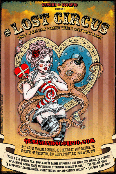 Dress code: Dark cabaret, traveling circus, steampunk Victorian, neo-tribal, funky formal, desert wanderer, Edward Gorey, Tim Burton, Mad Max, City of Lost Children — or at least cocktail attire. Stilts & characters welcome. Effort required / dress code more flexible after 1am.