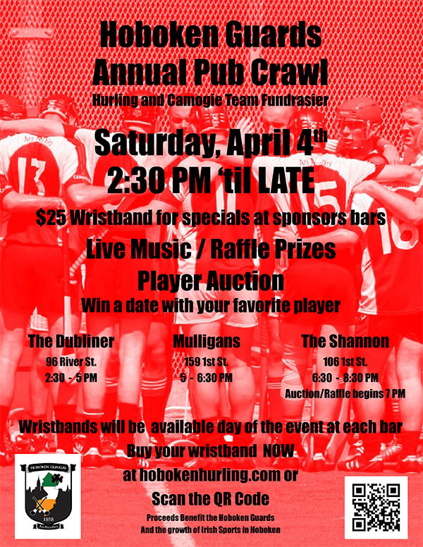 Auction allows local guys and gals the chance to bid on 15 of the guards top athletes (all in their 20s and 30s) – mirroring the number of players on the hurling “pitch†(or field) for one team at a time. Each hurler carries a gift certificate to a Hoboken or New York restaurant or business. Bidding starts at $20 per gift certificate-carrying athlete.