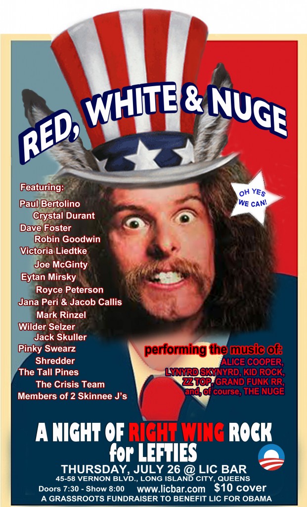A night of music of right wing rockers Lynyrd Skynyrd, Kid Rock, Alice Cooper, ZZ Top, Grand Funk RR and, of course, The Nuge! Right Wing Rock to Benefit for LIC 4 Obama – all good fun, in the spirit of bi-partisanship