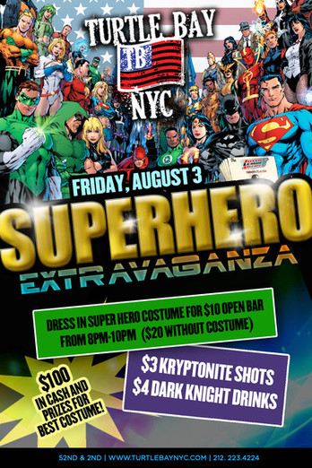 Dress as your favorite super hero for $10 open bar ($20 without costume) from 8-10pm.