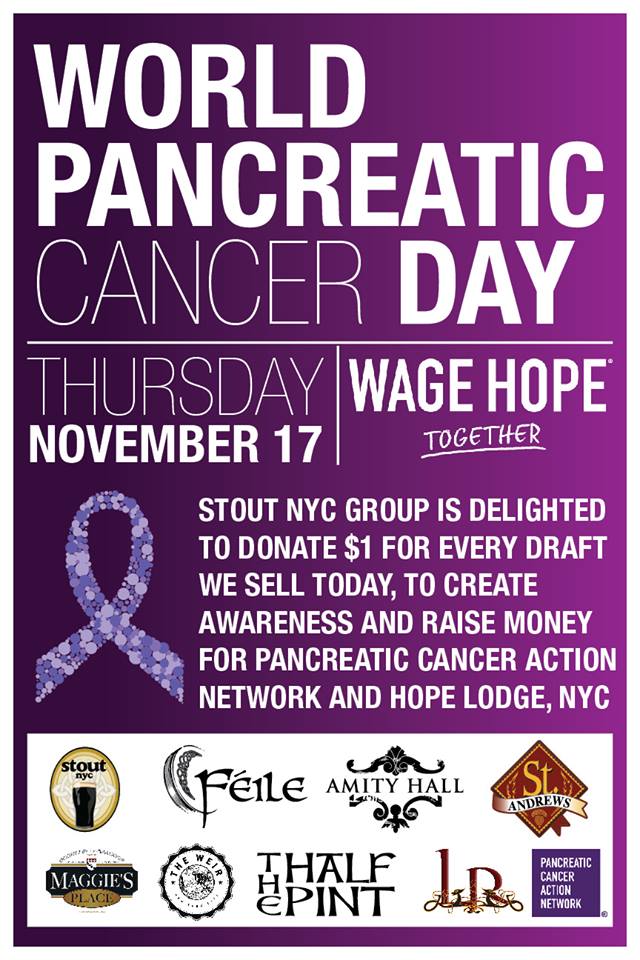 November 17 is World Pancreatic Cancer Day. One of New York City’s premier family of bars, The Stout Group, will be raising funds today at all of their locations. $1 of every draft beer they sell today will be donated to the Pancreatic Cancer Action Network and Hope Lodge NYC.