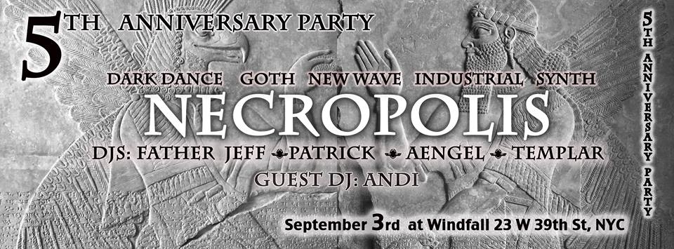 Windfall 3 W. 39th St. (between 5th & 6th Ave.), New York, NY, United StatesFriday, October 1, 2016 Necropolis New wave + dark dance + goth + synth + industrial Featuring DJs Father Jeff – Patrick – Aengel – Templar and special guest DJ Andi (Synthicide) Mandana at the gates.. Gerard and Julia at the bar RSVP via facebook $8 w/flyer or printout, $10 w/o 11pm – 4am at: […]