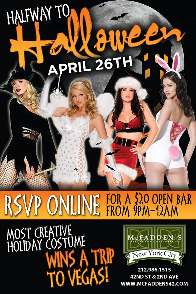 McFadden's 800 Second Ave. (42nd St.), New York, United StatesSaturday, April 26, 2014 Half Way to Halloween Party RSVP for $20 open bar from 9pm - 12am Most creative holiday costume wins a trip to Vegas at: McFadden’s Saloon 800 Second Ave. (42nd St.) New York, NY (212) 986-1515 McFaddens42.com