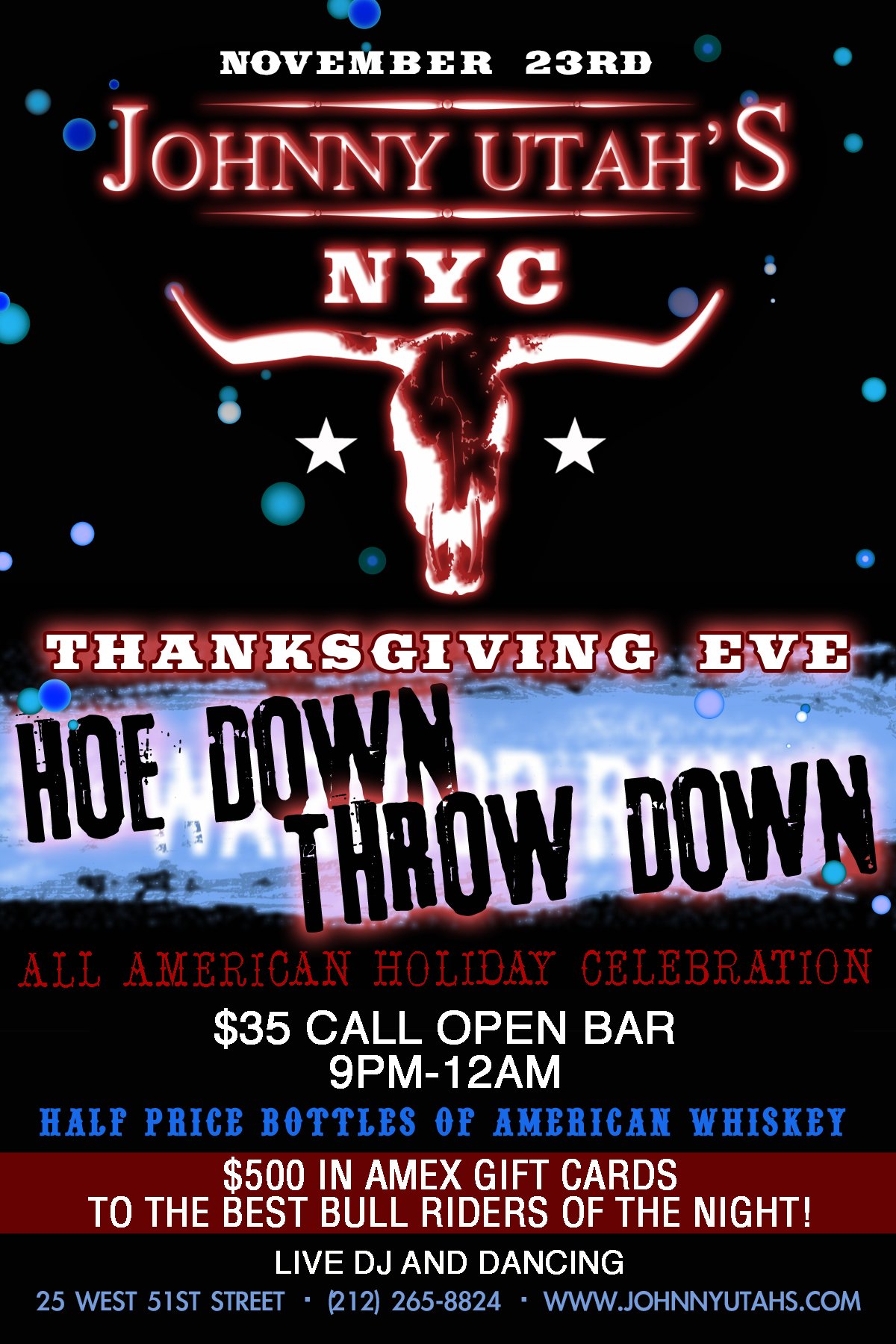 Johnny Utah's 25 W 51st St., New York, NY, United StatesWednesday, November 23, 2016 Thanksgiving Eve Hoe Down Throw Down $35 open bar half price bottles of American whiskey $500 Amex gift card to the longest bull ride of the night live DJ and dancing 9pm at: Johnny Utah’s 25 W. 51st St. (between Fifth & Sixth Ave.) Rockefeller Center (212) 265-UTAH JohnnyUtahs.com