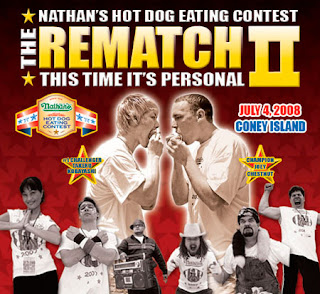 The big showdown today is a re-match with defending champion Joey Chestnut trying to retain his title, while six time champion Takeru Kobayashi of Japan tries to win it back.