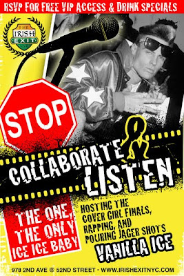 Vanilla Ice will be at The Irish Exit NYC hosting the cover girl finals, rapping and pouring shots of Jagar all night long.